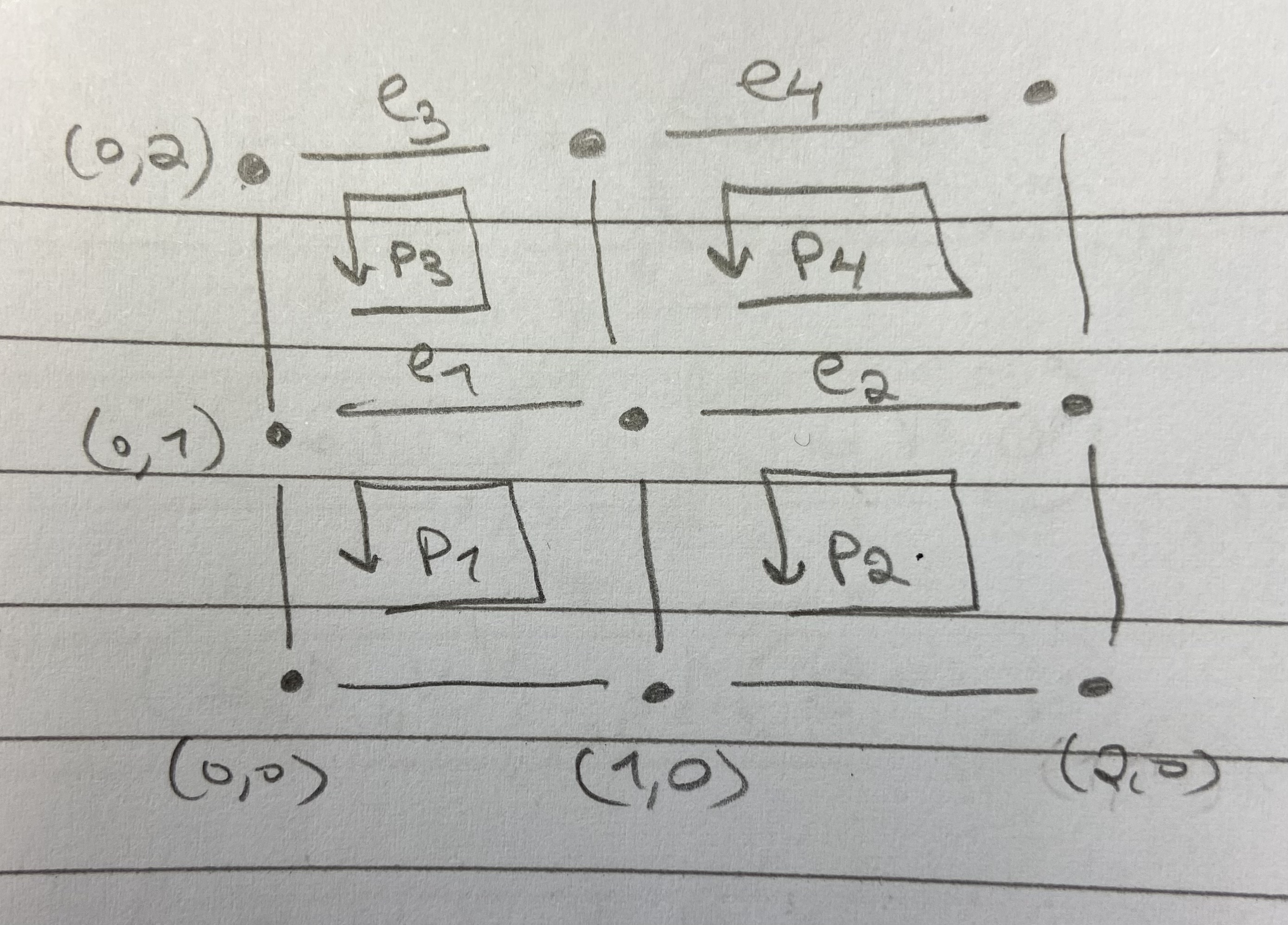 Thus, let’s compute \(l_3^0\). So we consider the box \(B_3\). Let \[e_1 = ((0,1),(1,1))\] \[e_2 = ((1,1),(2,1))\] \[e_3 = ((0,2),(1,2))\] \[e_4 = ((1,2),(2,2))\] be shorthand notation for the edges in \(E_3^1\). The plaquettes are \[p_1 = ((0,0), 1,2)\] \[p_2 = ((1,0), 1,2)\] \[p_3 = ((0,1), 1,2)\] and \[p_4 = ((1,1), 1,2).\]